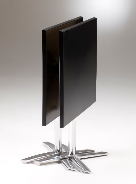 Basamento per tavolo quadrato o rotondo (max 80 cm) in alluminio anodizzato naturale, piede a 4 razze con 2 piedini regolabili, meccanismo ribaltabile in resina con blocco di sicurezza.