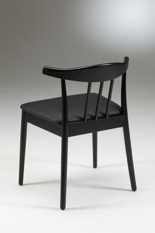 Sedia da interno in legno curvato, seduta imbottita tappezzata, schienale con braccioli incorporati e tondini verticali