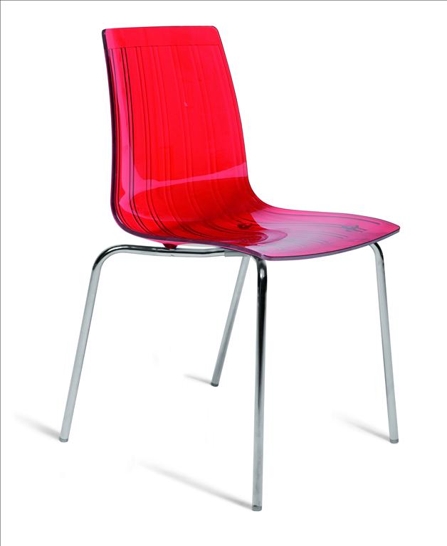 Sedia impilabile con scocca a stampo unico in policarbonato, struttura a 4 gambe in acciaio cromato.